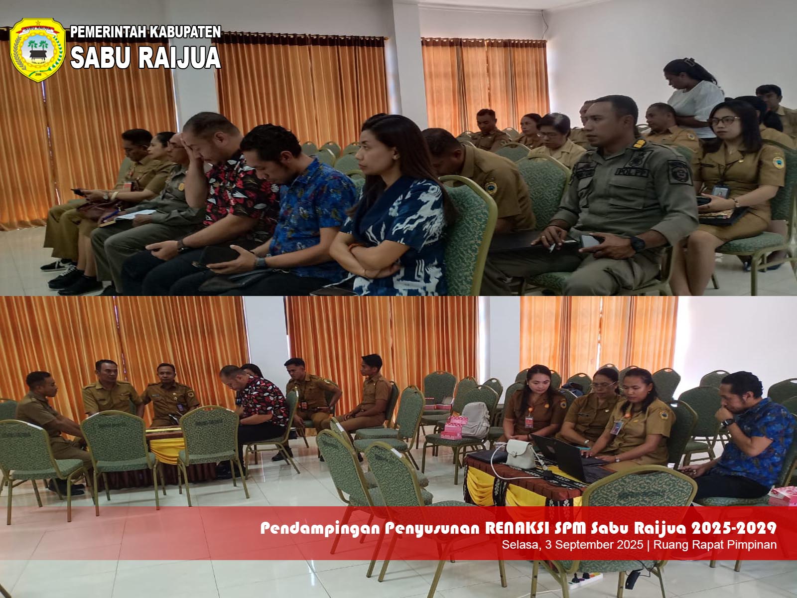 PROKOPIM, Menia - Pemerintah Kabupaten Sabu Raijua Resmi Membuka Kegiatan Penyusunan Rencana Aksi Daerah Standar Pelayanan Minimal (RAD-SPM) Periode 2025–2029. Kegiatan ini berlangsung di Ruang Vicon Lantai 2 Kantor Bupati Sabu Raijua, Selasa (02/09/2025)