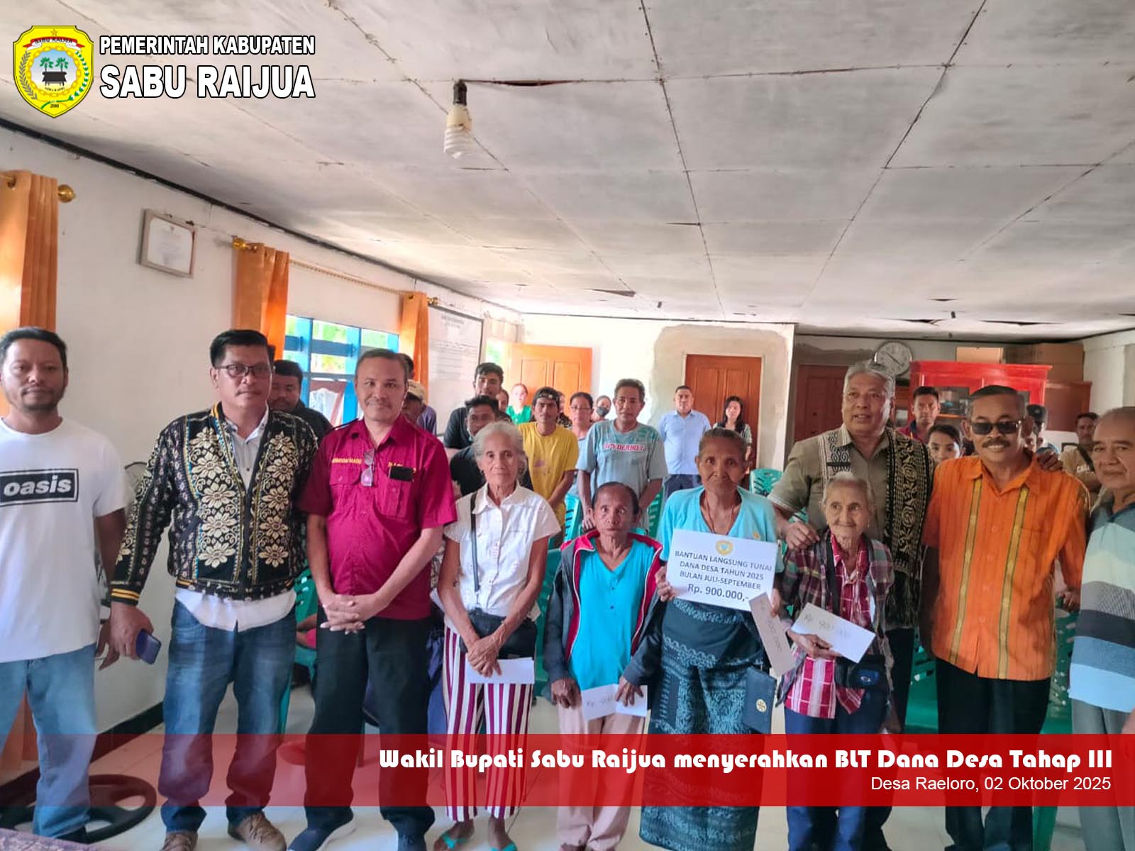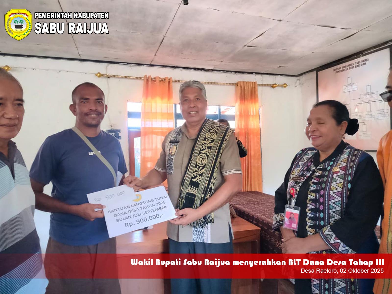 Wakil Bupati Sabu Raijua, Ir. Thobias Uly, M.Si bersama Plt. Kepala Dinas PMD Kabupaten Sabu Raijua melakukan kunjungan kerja ke Desa Raeloro, Kecamatan Sabu Barat. Dalam kunjungan ini, Wakil Bupati menyampaikan sejumlah program pemerintah daerah yang bertujuan mendukung peningkatan kesejahteraan masyarakat, sekaligus melakukan penyerahan secara simbolis Bantuan Langsung Tunai (BLT) Dana Desa Tahap III.